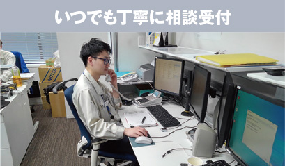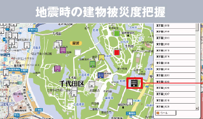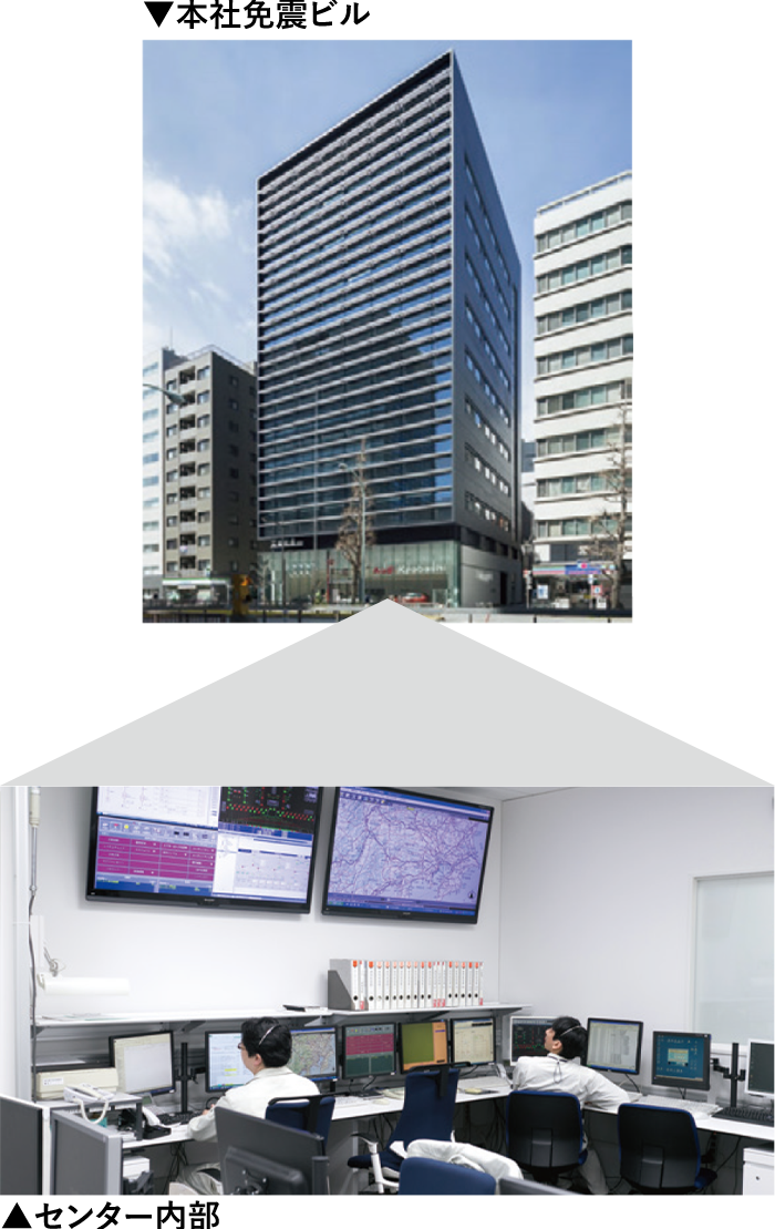 シミズ24時間建物管理・情報センター 本社免振ビル内に設置されたセンターより24時間お客様の建物を守ります。 平常時 ▲24時間相談受付 ▲地図システムによる建物表示 緊急災害時 ▲管理施設災害時外の復旧支援 ▲建物被害度の地図上での把握